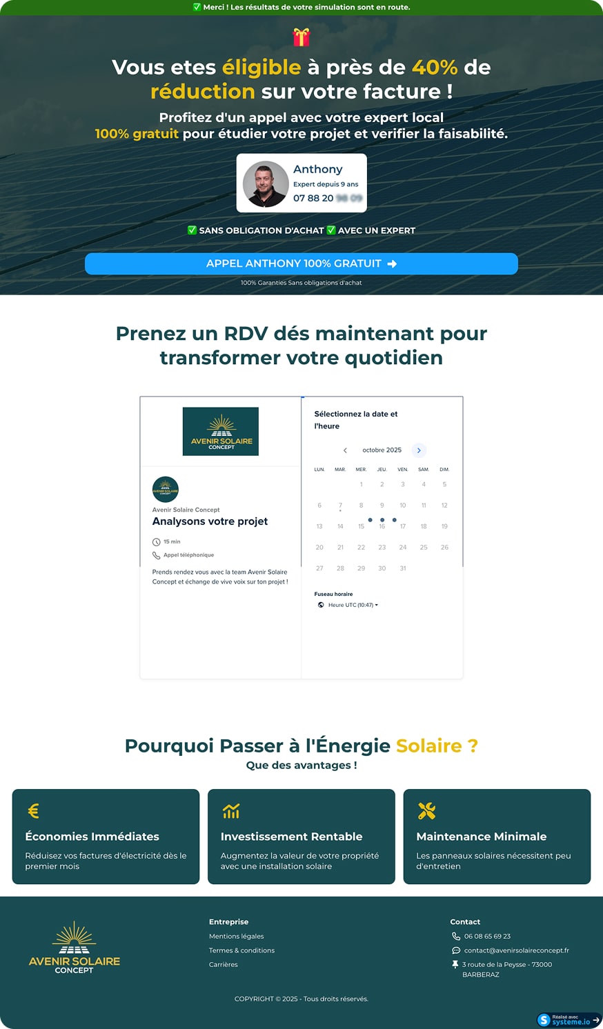 Résultat : chez nos installateurs, les faux numéros sont passés de 28% à moins de 4%. Vos commerciaux appellent des gens qui ont rempli un formulaire, qui ont un projet, et qui décrochent.